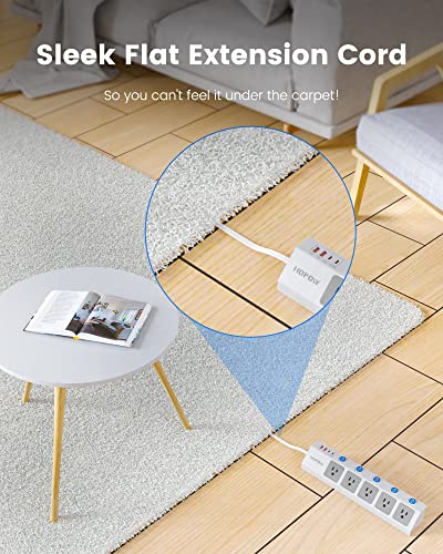 [Extremely Thin Extension Cord]: The 10 feet flat cable is 50% thinner than the traditional power cords to run it under a rug or along walls without adding unsightly bulk or creating a commute hazard. It can keep unsightly cords hidden and allows furniture placement with no need to accommodate them.