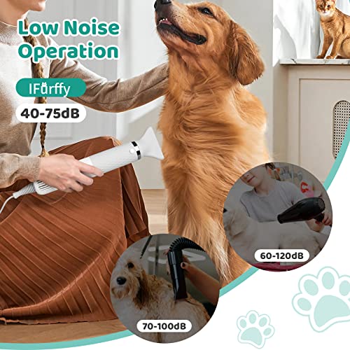 5 In 1 Set: IFurffy dog blower grooming dryer with 4 additional nozzles. Whether your pet has long or short hair, needs to dry the hair or style it, IFurffy high velocity dryer for dogs can meet all of your needs. Giving you more product experience for less money! ( 4 air nozzles: concentrator nozzle, wide flat nozzle, wide tooth comb Nozzle, grooming brush.) The perfect gift for mom on Mother’s Day!