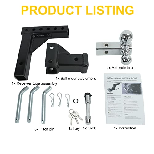 The product includes – you’ll receive three different sizes of balls (1-7/8-inch, 2-inch, 5-5/16-inch), 1x Ball mount weldment, 1x Receiver tube assembly, 3x Hitch pin, 3x Key ,1x Lock.